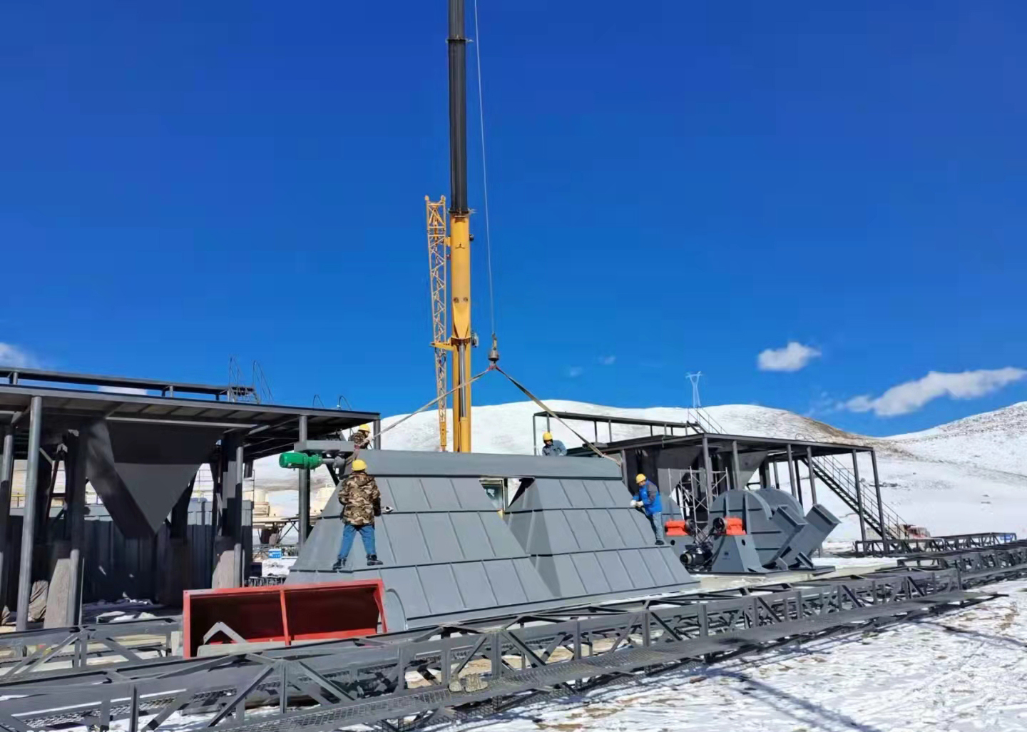 鹽富環(huán)保理塘項目配套的除塵和選粉設備進入安裝調(diào)試階段,為確保川藏鐵路理塘段項目的順利推進,我司參與此項目的所有成員,在春節(jié)這樣萬家團聚的節(jié)日里,都堅守在自己的工作崗位上,虎力全開,干勁十足!理塘氣候?qū)俑咴瓪夂騾^(qū),海拔約4300米, 氣溫-30.6℃,冬季干冷而漫長。由于項目地點海拔高,氧氣稀薄,許多人有高原反應,但他們都努力克服身體上的種種不適,以積極樂觀的心態(tài)面對種種困難,活出了當代勞動者的風采!這幾天,風雪交加,氣候寒冷,我們的施工現(xiàn)場仍然是一派熱火朝天!